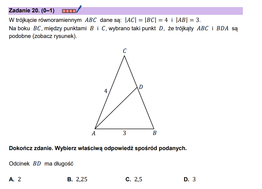 Zadanie 20 W trójkącie równoramiennym 𝐴𝐵𝐶 dane są: |𝐴𝐶| = |𝐵𝐶| = 4 i |𝐴𝐵| = 3.Na boku 𝐵𝐶, między punktami 𝐵 i 𝐶, wybrano taki punkt 𝐷, że trójkąty 𝐴𝐵𝐶 i 𝐵𝐷𝐴 są podobne
