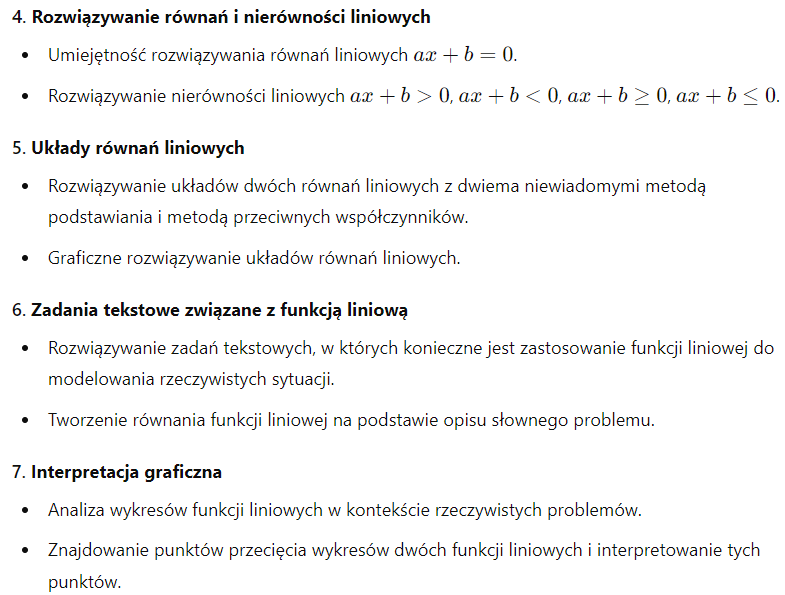 • Rozwiązywanie zadań tekstowych, w których konieczne jest zastosowanie funkcji liniowej do modelowania rzeczywistych sytuacji.